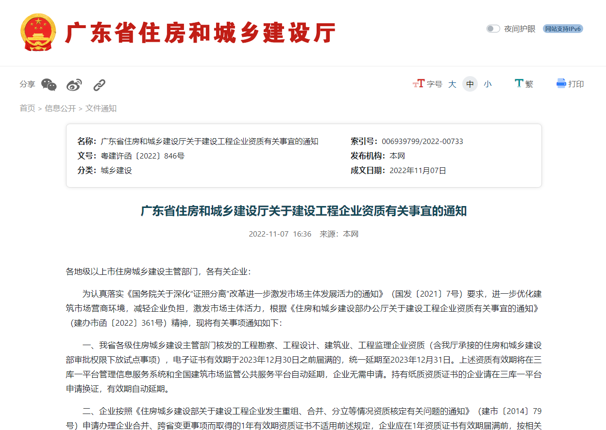 廣州市住房和城鄉(xiāng)建設(shè)局轉(zhuǎn)發(fā)省住房城鄉(xiāng)建設(shè)廳關(guān)于建設(shè)工程企業(yè)資質(zhì)有關(guān)事宜的通知 2022-11-14